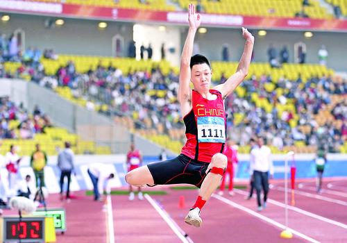 ▶10月24日,中国选手王嘉男在比赛中。 当日,在武汉举行的第七届世界军人运动会田径项目男子跳远决赛中,中国选手王嘉男、黄常洲分别以8米15和8米12的成绩获得冠亚军。 新华社发