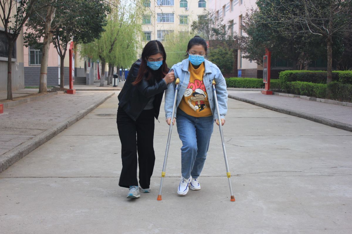 前不久,王一丹脚踝骨折,做了手术后行动不便。为不耽搁其他同学的时间,今年开学复课后,畅丽君主动照顾王一丹的生活,每天早上把她从宿舍搀扶到教学楼三楼,晚上再从教学楼送回宿舍。