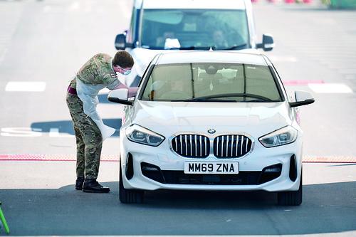 ▲4月8日,在英国曼彻斯特,一名军人对汽车内的被检测者进行采样。 英国曼彻斯特机场附近有一家新冠病毒检测中心,被检测者驾车驶入,无需下车便可以接受检测。很多军人在此协助检测。新华社发