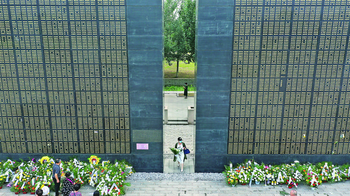 7月28日,市民拿着花从纪念墙间走过(无人机照片)。 当日是唐山大地震44周年,许多市民来到唐山地震遗址纪念公园,在纪念墙前献上鲜花,祭奠遇难的亲人。