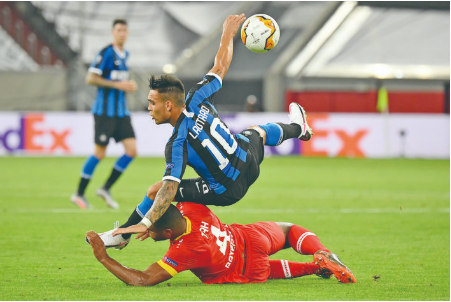 ▶8月10日,国际米兰队球员劳塔罗·马丁内斯(上)与勒沃库森队球员乔纳森·塔在比赛中与拼抢。 当日,在德国杜塞尔多夫进行欧罗巴联赛四分之一决赛中,意甲国际米兰队以2比1战胜德甲勒沃库森队,晋级半决赛。新华社发(欧足联供图)