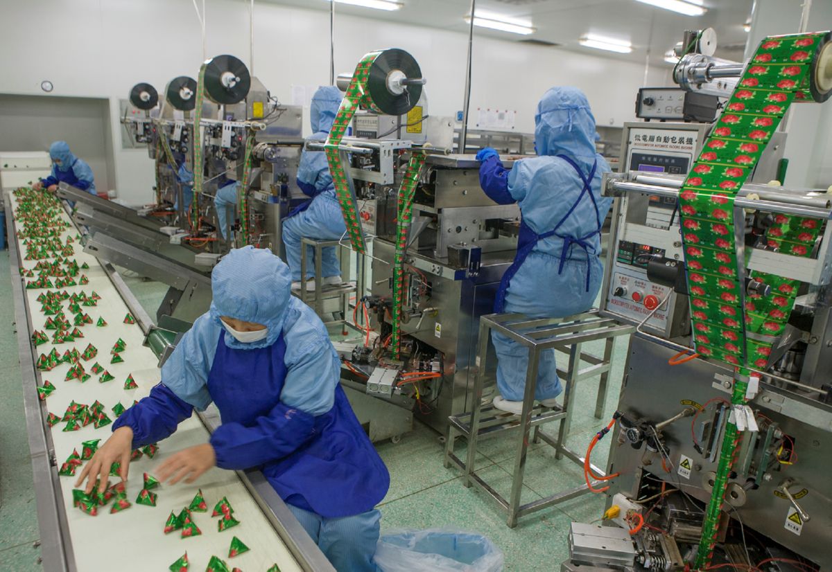 ▲万荣喜凌果汁食品有限公司的工人在加工果圈