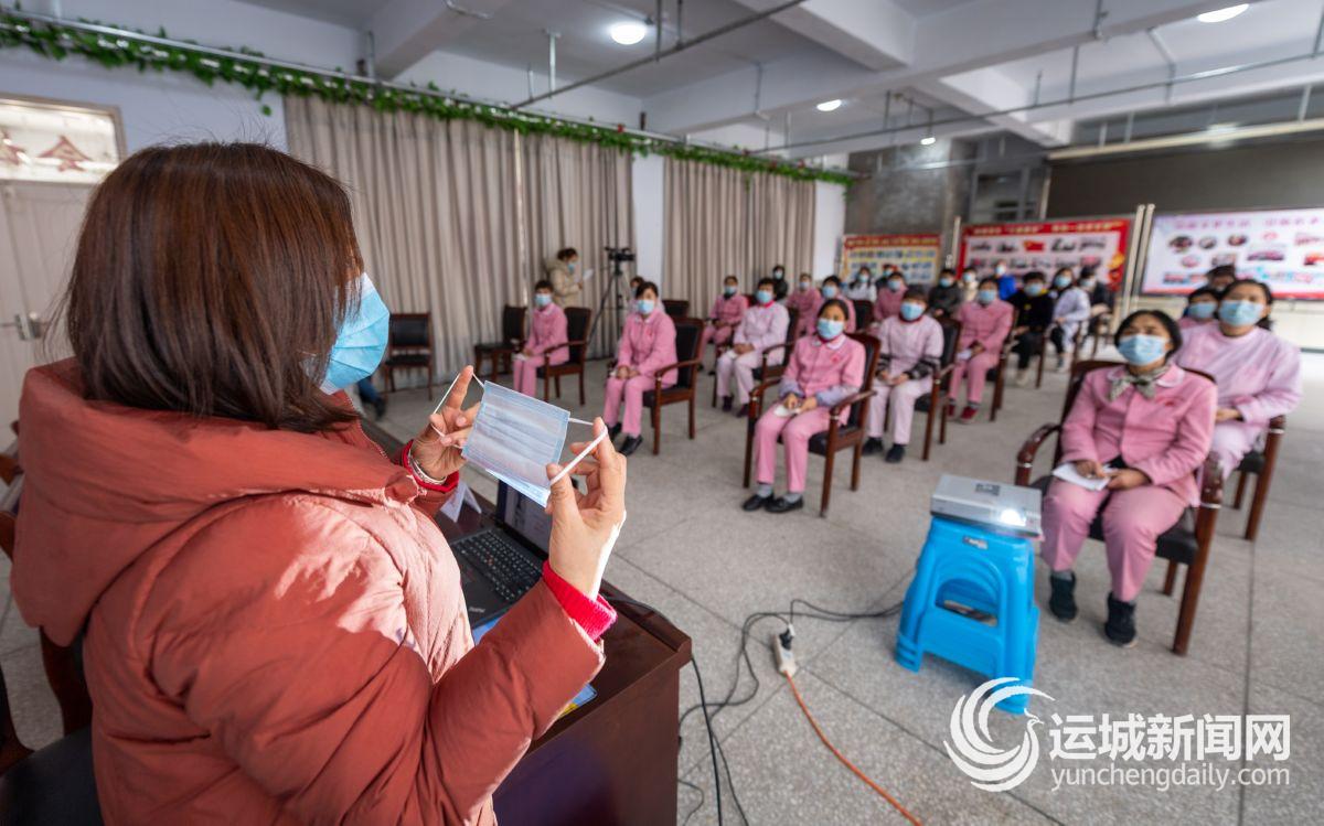 来自运城市中医医院的医护人员,为该中心护理员讲解如何正确佩戴口罩。