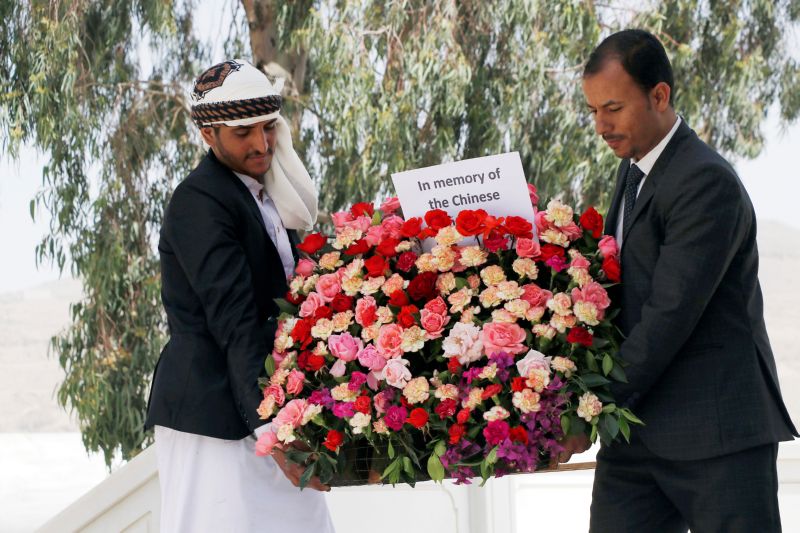 ▲4月5日,两名也门男子在首都萨那中国烈士陵园敬献鲜花。中国传统节日清明节期间,也门民众来到位于首都萨那的中国烈士陵园,凭吊那些为促进中也友谊而献出生命的中国烈士。
