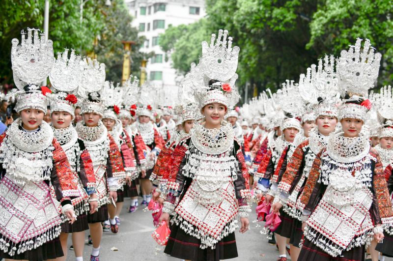 ▲4月25日,苗族群众在参加“2021中国台江苗族姊妹节”盛装巡游。