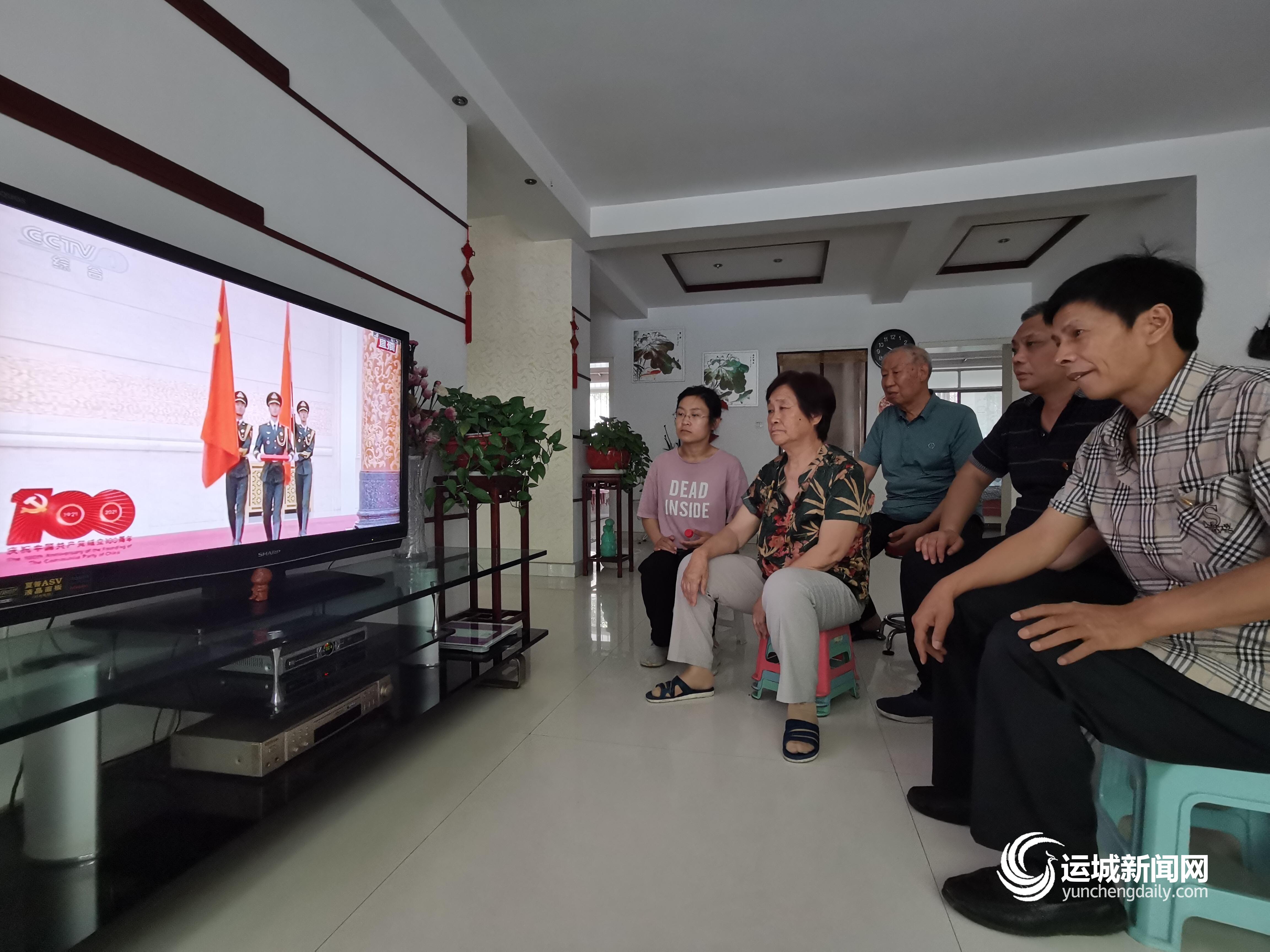 6月29日,盐湖区东城办名邸社区工作人员在辖区老党员尉文昌(左三)家中,观看“七一勋章”颁授仪式直播。