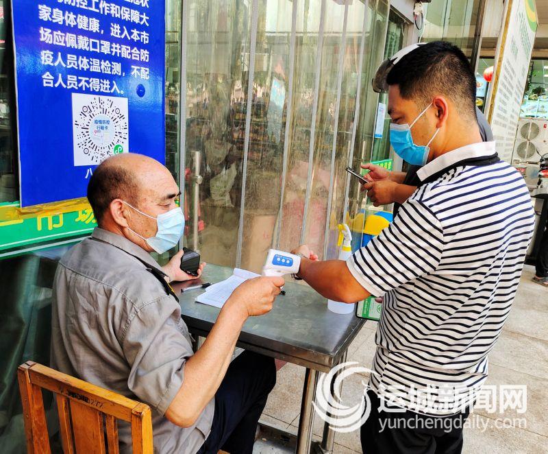 市民在八一市场入口处登记信息、测量体温
