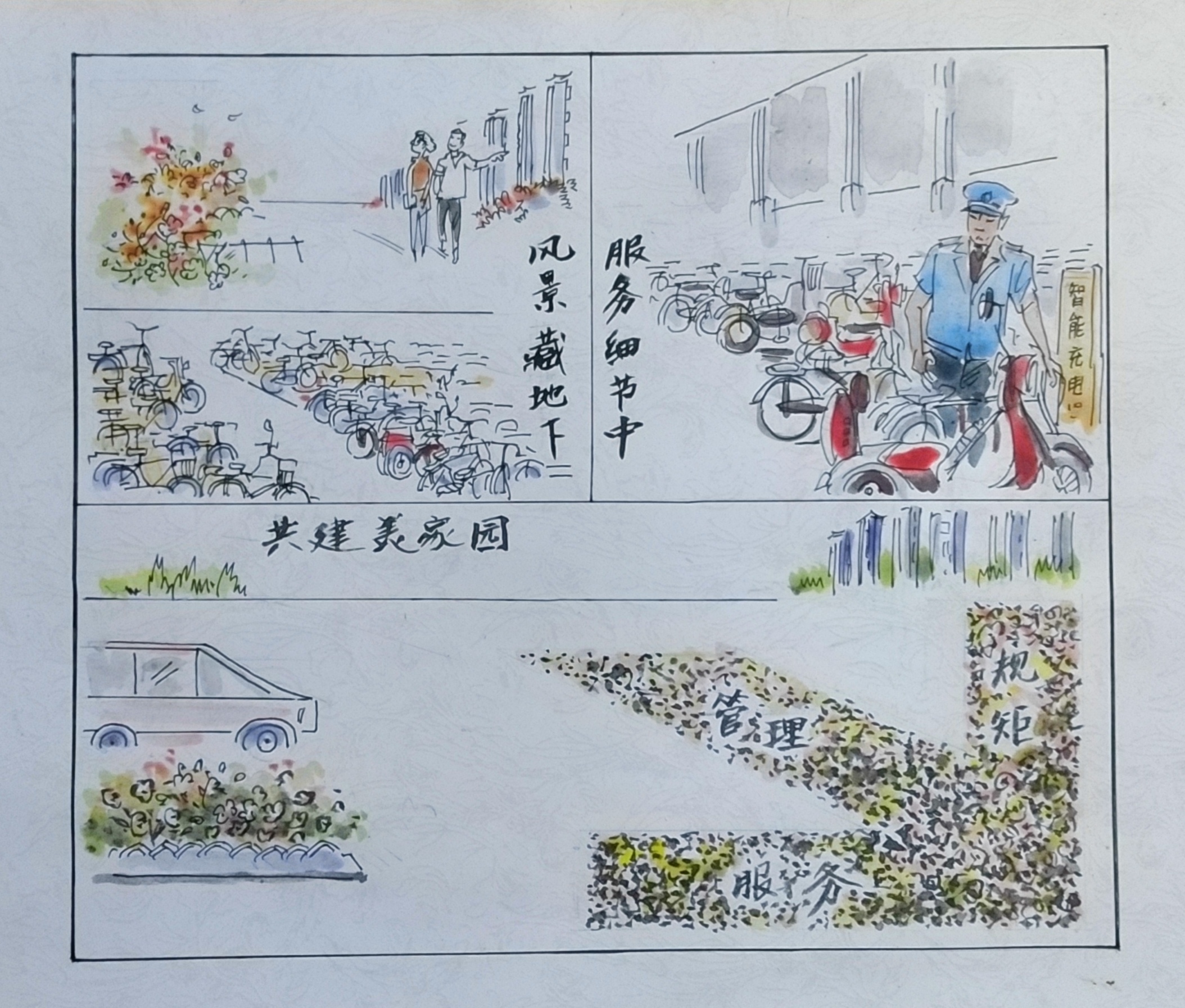 一套严格的管理制度。为了规范停车秩序,物业服务中心专门制定了《非机动车辆管理制度》。其内容包括10余项,如要求居民必须在指定区域按顺序整齐停放车辆,不能阻挡通道;所有车辆必须平行停放,车头朝向充电插座方向,禁止乱停乱放等。