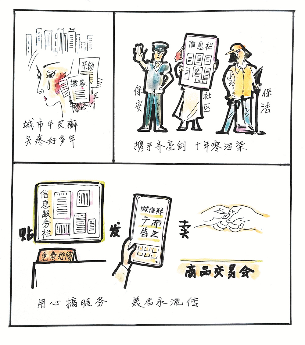 在黄金水岸小区,物业可为居民提供免费维修水龙头、更换灯泡、疏通下水道或马桶等日常生活服务,让生活信息类小广告毫无市场。对于像搬家、找保姆、找月嫂等其他生活需求,小区物业在“贴、发、卖”三字上进行了有益探索。