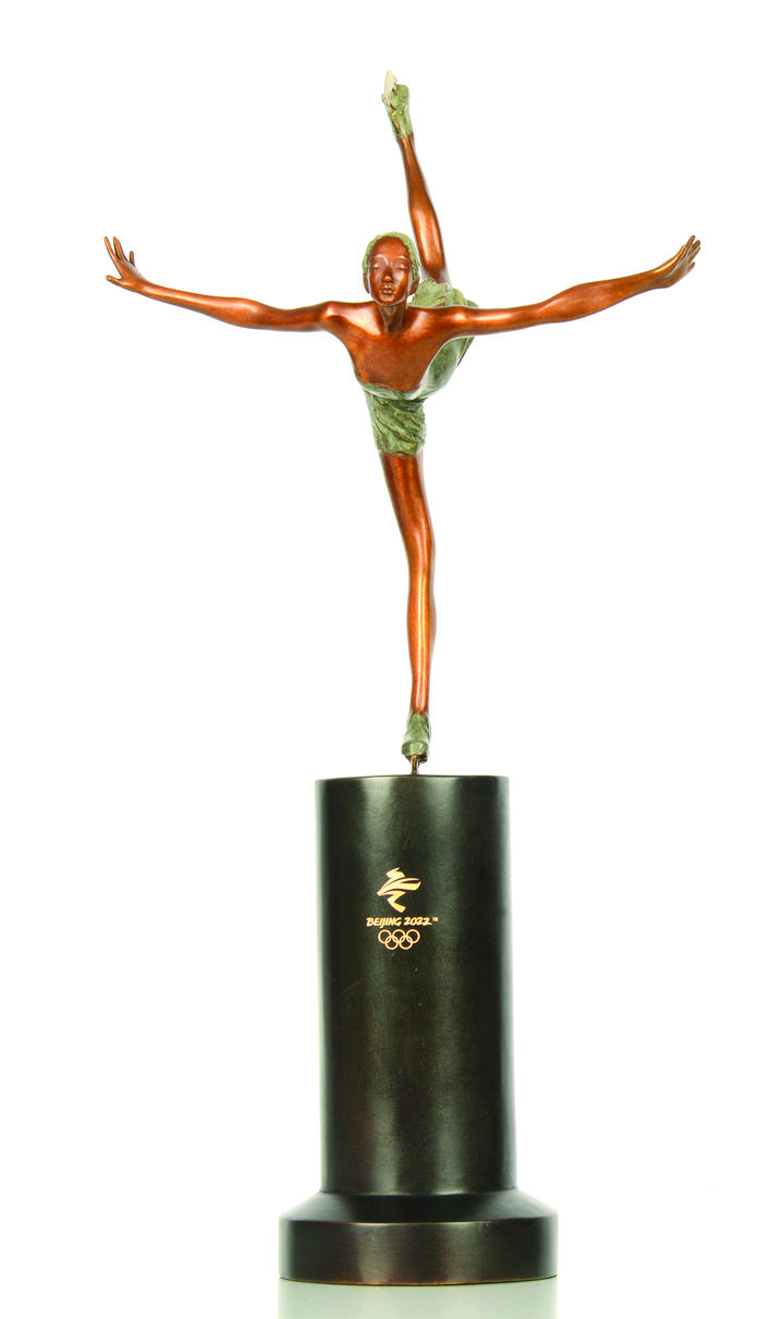 《冬奥之尊》,高56厘米,由国家一级美术师孙红创意设计,宇达公司精心铸造制作。
