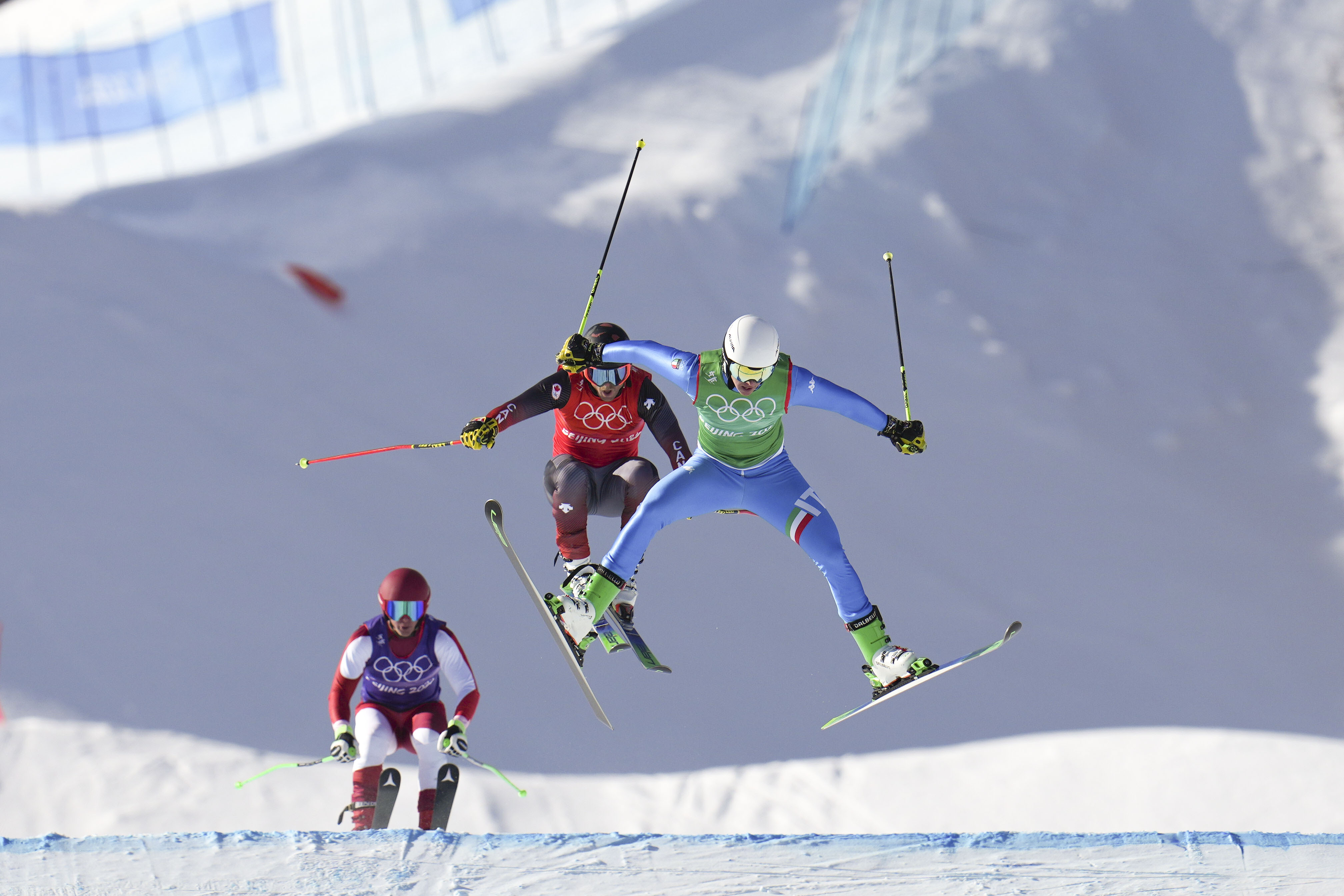 2月18日,意大利选手西莫内·德罗梅迪斯、加拿大选手布拉迪·莱曼、奥地利选手约翰内斯·罗韦克(右至左)在比赛中。 当日,北京2022年冬奥会自由式滑雪男子障碍追逐比赛在张家口云顶滑雪公园举行。 新华社记者 胡虎虎 摄