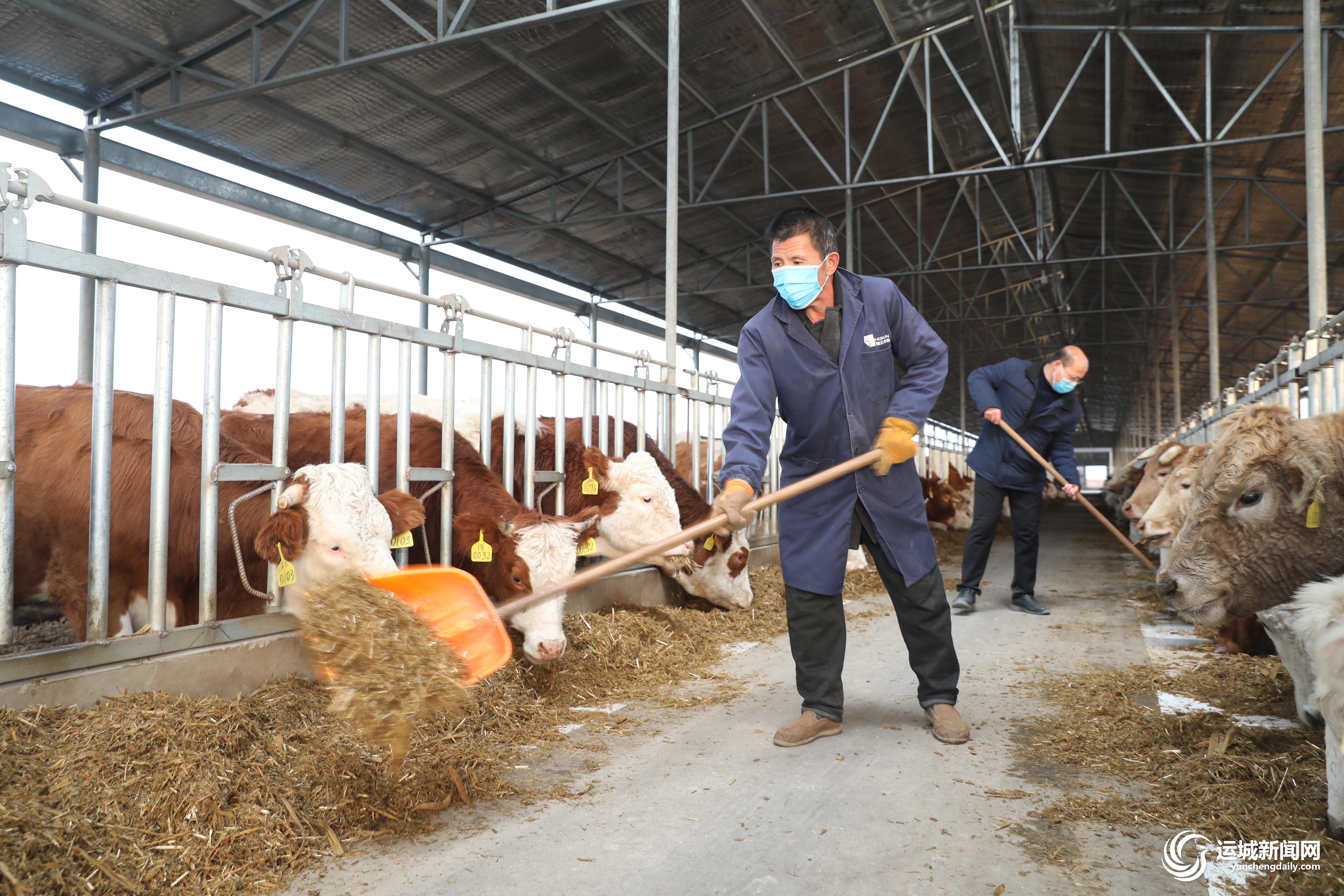 12月12日,万荣县鸿瑞祥养殖有限公司养牛基地,饲养员在喂养西门塔尔牛。