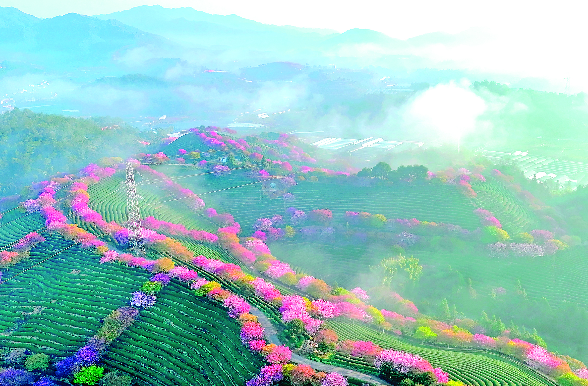 近日,福建省漳平市永福镇台品樱花茶园里的樱花迎来最佳赏花期,吸引众多游客观赏。 新华社记者 魏培全 摄