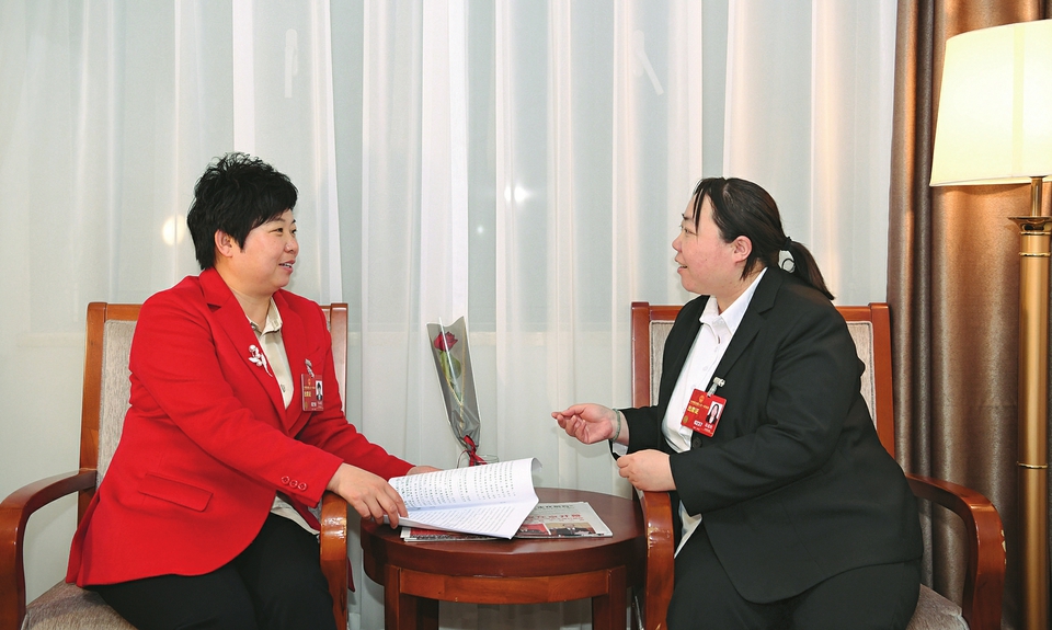 马金莲代表和许连红代表围绕技能培训拓宽就业渠道的话题进行讨论。