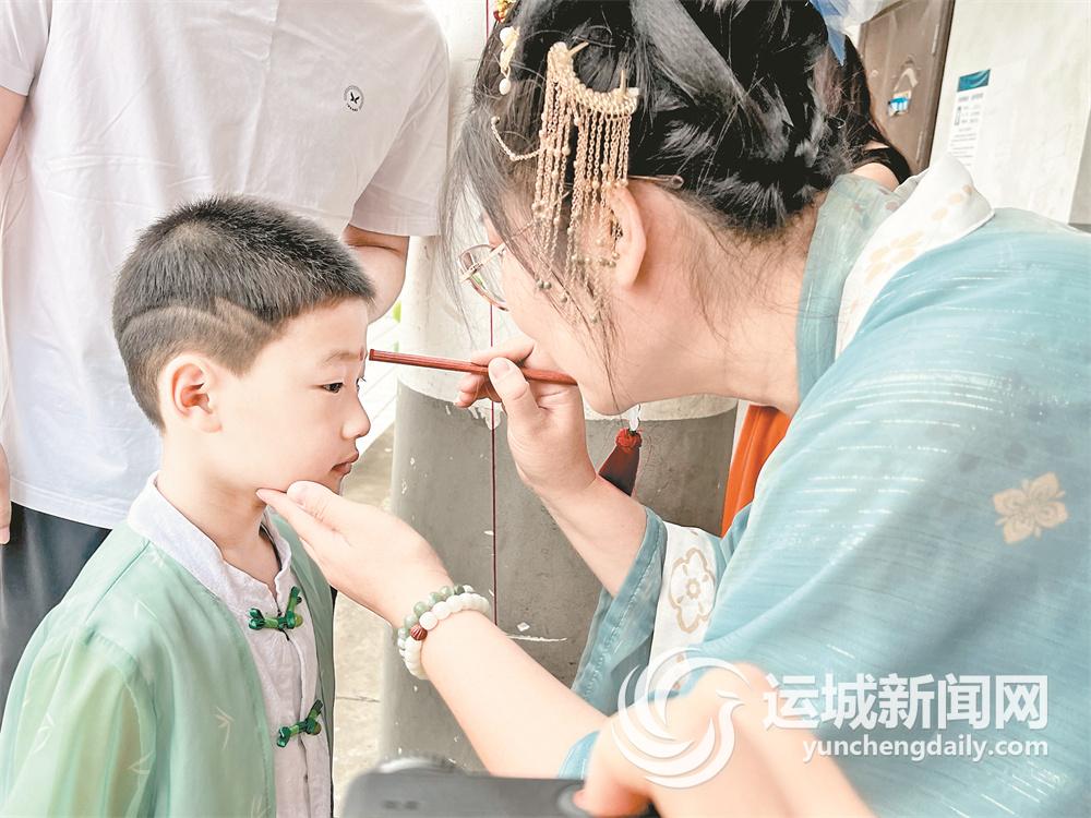 活动在孩子们的汉服秀中拉开帷幕;接着孩子们体验了点朱砂(上图)、系五彩绳、挂艾草等,了解端午节的由来和传统习俗,孩子们在家长的陪同下,亲手制作了艾草花束;在端午知识竞赛活动中,孩子们时而竞相抢答,时而静心思考,时而相互交流,现场一片欢声笑语。