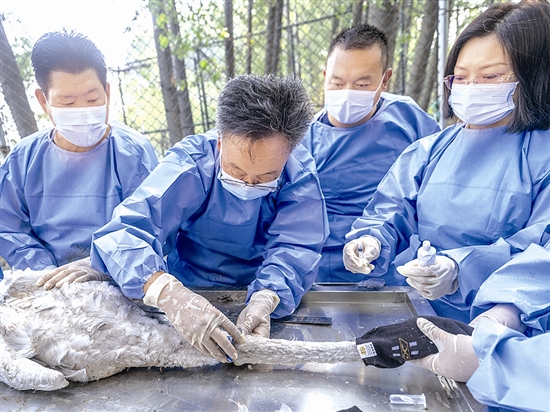 今年5月1日,一对留守三门峡的大天鹅成功孵化出3只幼天鹅。如今,幼天鹅已经4个多月,体形接近成年大天鹅。为了更进一步对大天鹅开展研究,每年全国鸟类环志中心委托三门峡大天鹅环志站,对在当地越冬栖息的大天鹅进行抽样佩戴环志环和无线信号追踪器,并对这些大天鹅进行信息跟踪、测量采集,为相关研究提供可靠数据。据悉,近年来,三门峡大天鹅环志站已经为在这里越冬栖息的550多只大天鹅佩戴了环志环、无线信号追踪器。 记者 杜杰 摄