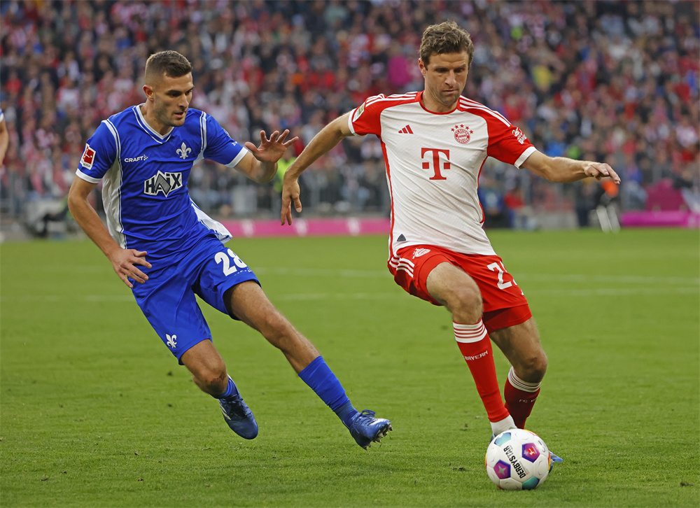10月28日,拜仁慕尼黑队球员穆勒(右)与达姆施塔特队球员弗拉尼奇在比赛中拼抢。当日,在2023~2024赛季德国足球甲级联赛第九轮比赛中,拜仁慕尼黑队主场以8比0战胜达姆施塔特队。