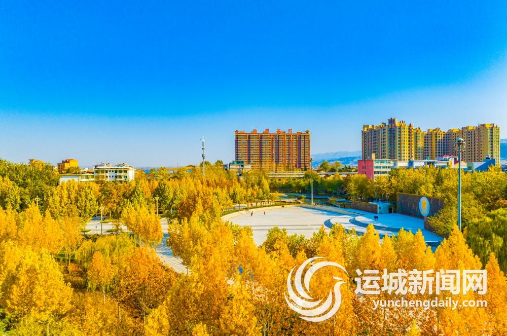近日,夏县莲湖公园金黄色的树叶与蓝天白云相互辉映,构成一幅冬日美景图。