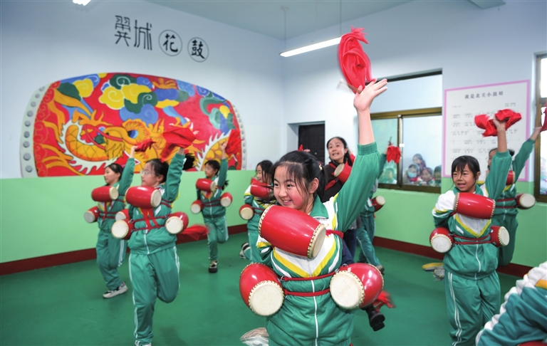 1月5日,翼城县北关小学学生在老师指导下排练“翼城花鼓”。随着春节临近,该校结合实际创新编排,在课堂上将铿锵的鼓点敲起来,使这一国家级非遗项目融入迎春文化活动。记者 闫锐鹏 摄