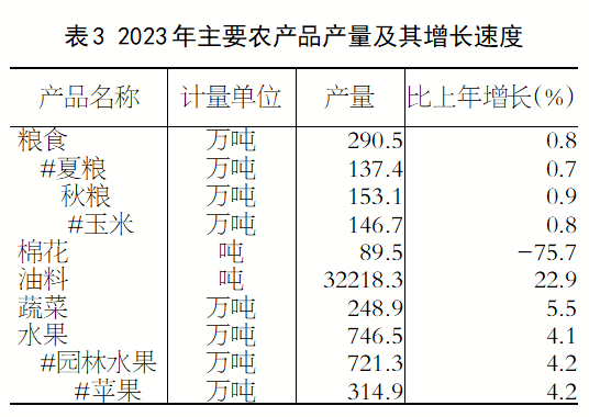 全年全市农作物种植面积654.0千公顷,比上年增长0.6%。粮食种植面积541.1千公顷,增长0.4%。其中,夏粮282.0千公顷,增长0.4%;秋粮259.1千公顷,增长0.4%(玉米239.2千公顷,增长0.4%)。棉花种植面积0.06千公顷,下降76.6%;油料种植面积12.8千公顷,增长22.2%;蔬菜及食用菌种植面积53.9千公顷,增长2.5%。果园面积192.6千公顷,下降0.4%,其中,苹果园面积77.4千公顷,下降2.5%。