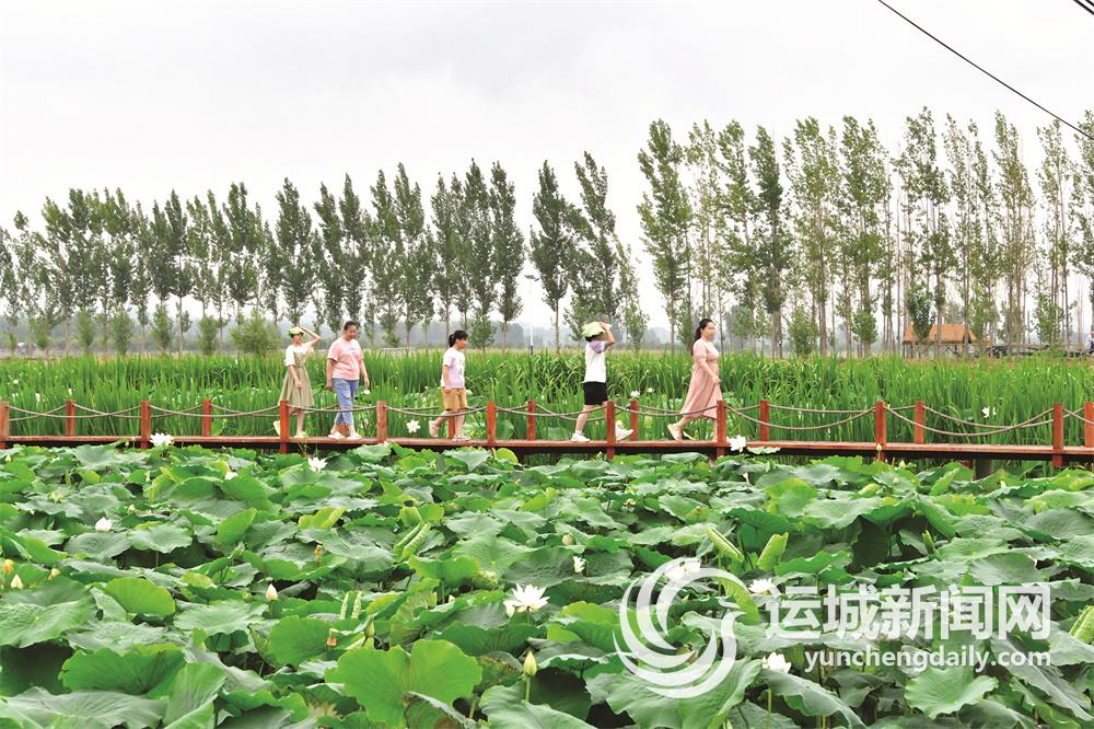 7月1日,游客在新绛县娄庄村荷塘边游玩。