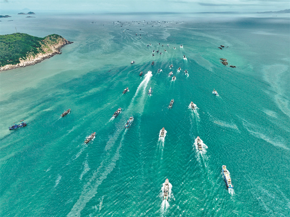 8月16日,在福建省福州市连江县黄岐国家中心渔港,渔船开渔出海(无人机照片)。