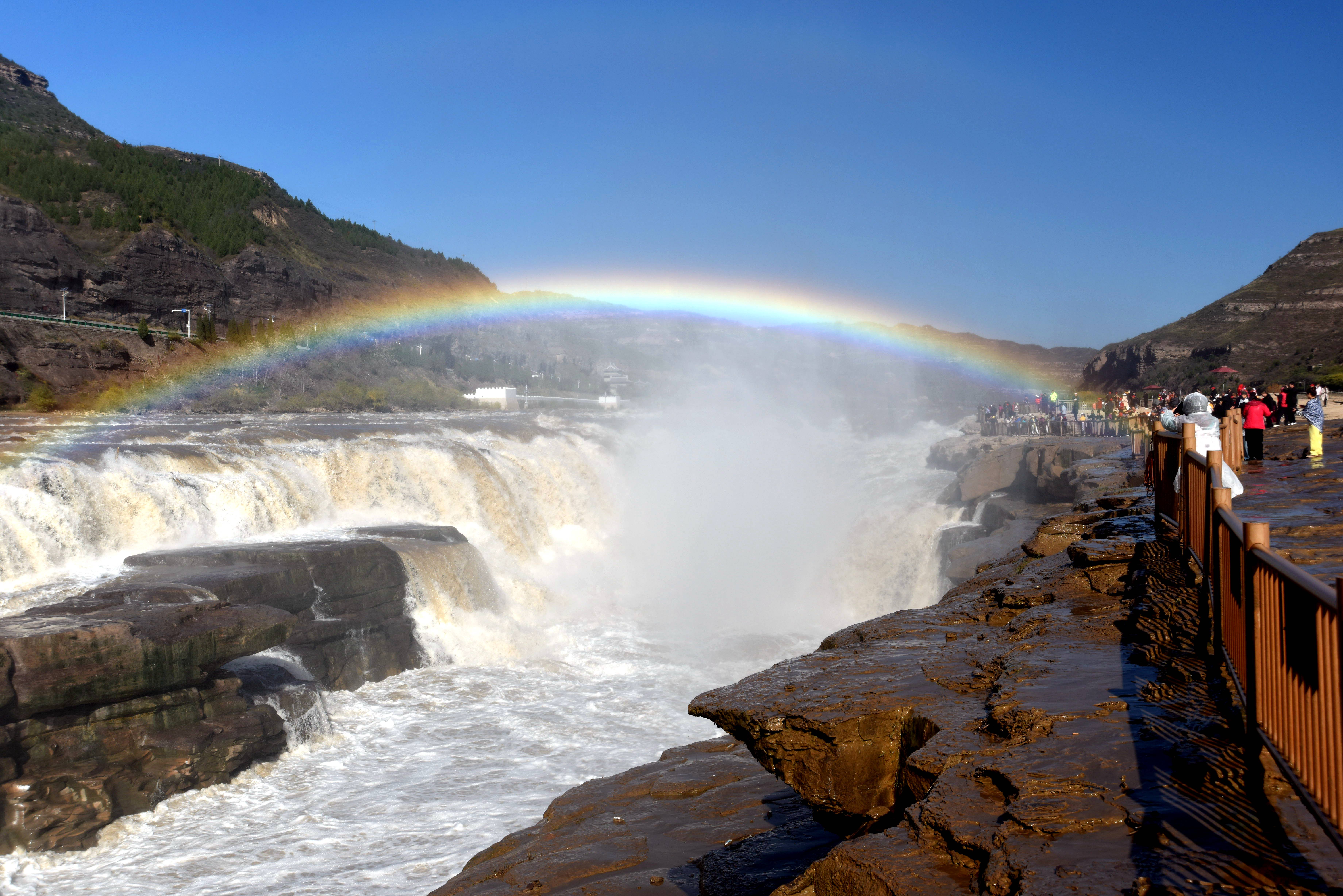 深秋时节,受水库调节放水影响,位于山西吉县和陕西宜川县交界的黄河壶口瀑布水量增大,飞溅的水雾在阳光的照射下,形成“彩虹桥”景观。