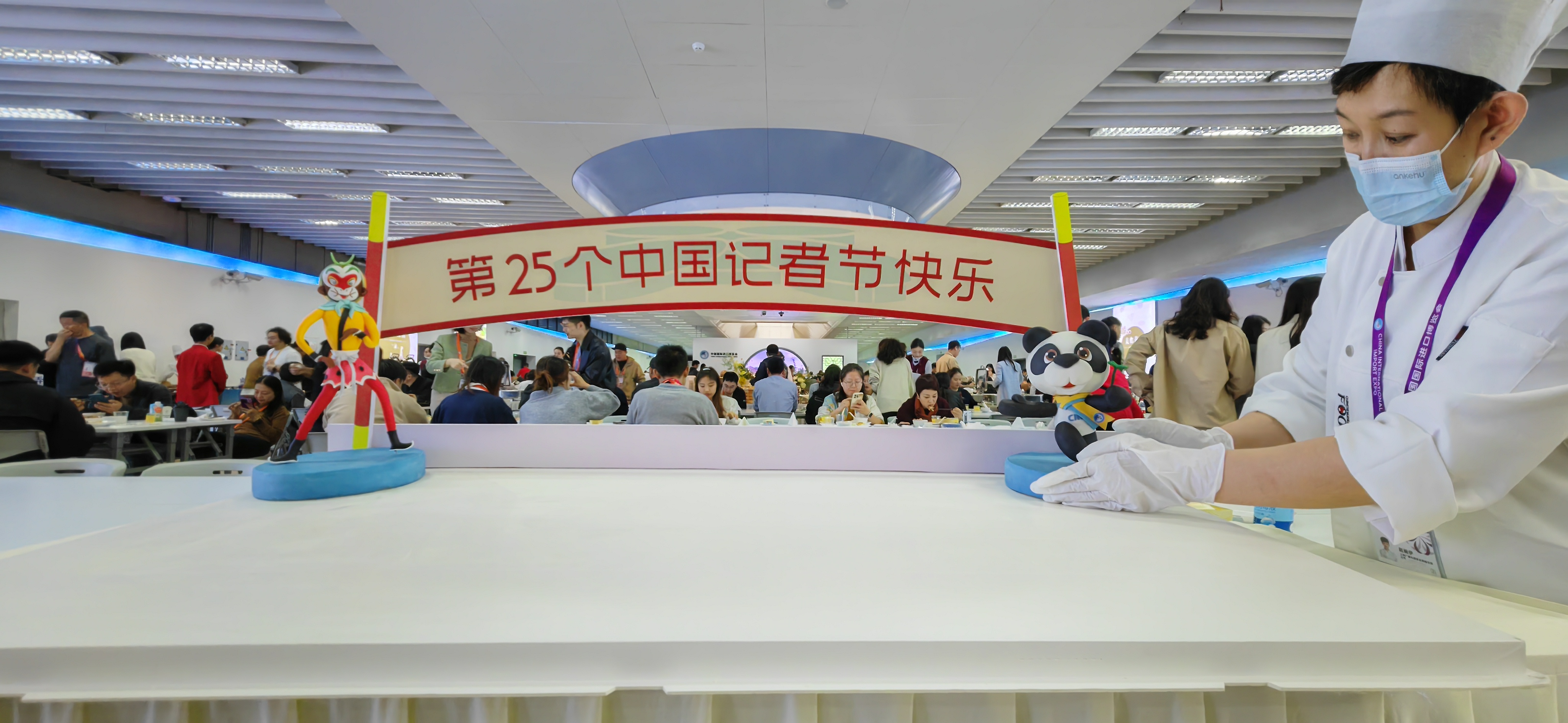 11月8日在进博会新闻中心餐厅拍摄的庆祝记者节的装饰牌。