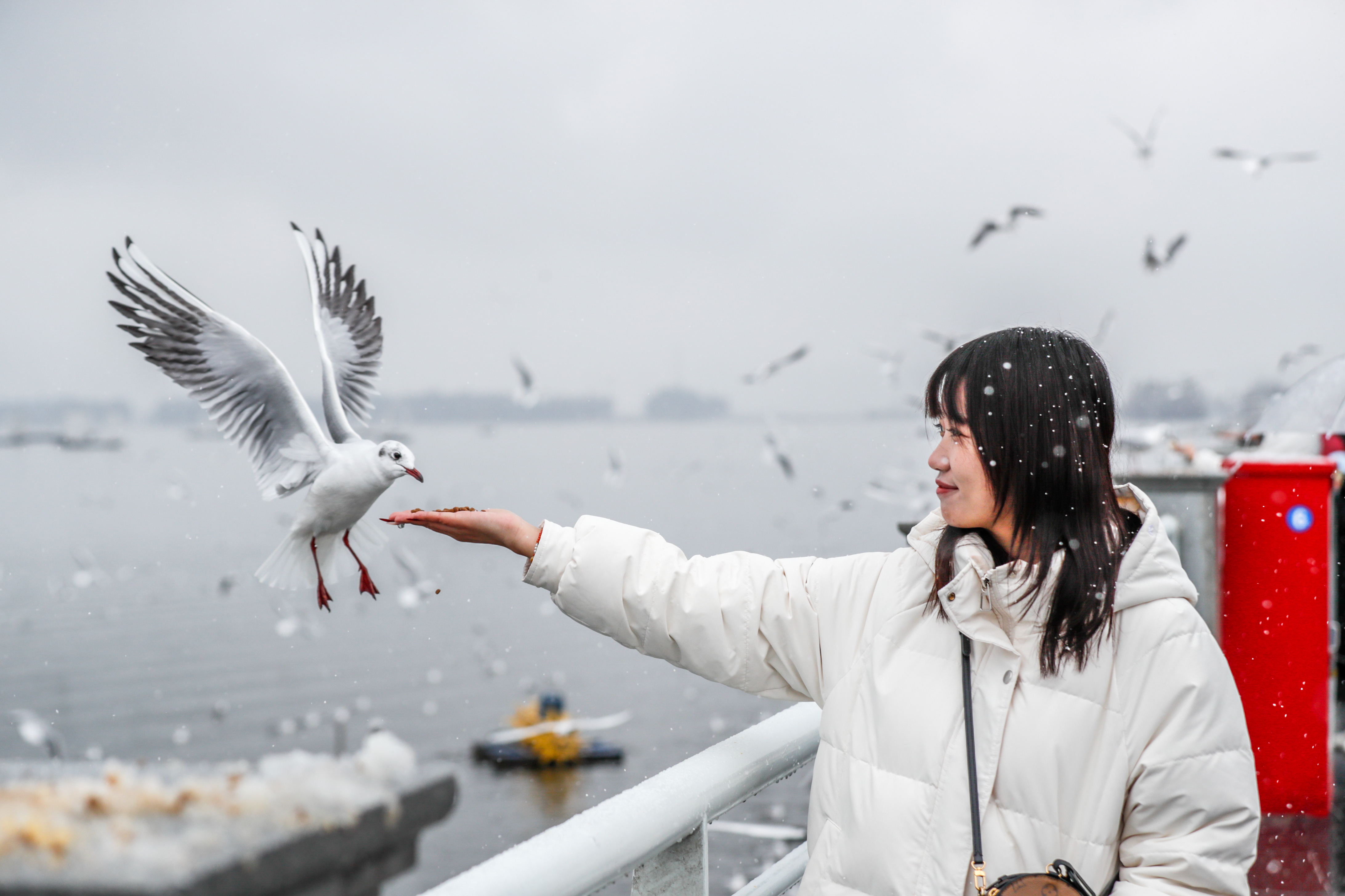 1月27日,一名女士在昆明市海埂大坝喂食红嘴鸥。