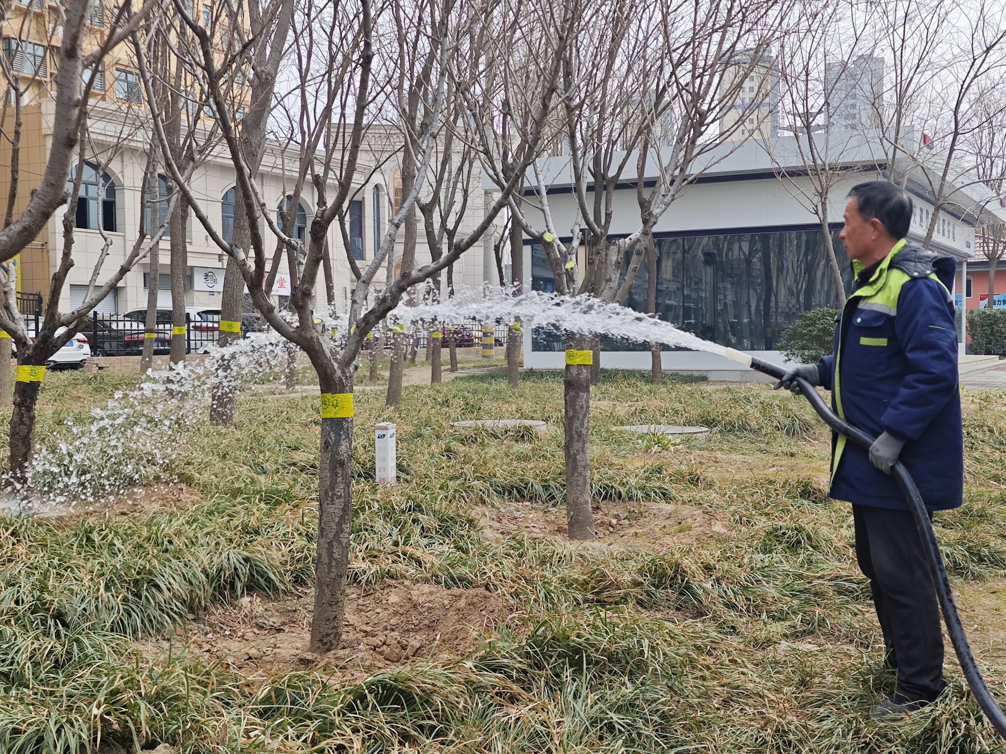 “最近气温逐渐回升,绿植又开始了新一轮生长。去年冬天降雪量较少,土壤偏干,所以我们要抓紧时间进行春浇,让绿植喝好今年的第一口水,使其尽快复苏。本轮春浇将持续半个多月,在浇水过程中我们会加入适量肥料,为绿植生长提供充足的水分和养分。”市园林绿化服务中心东片区管护部相关负责人说。