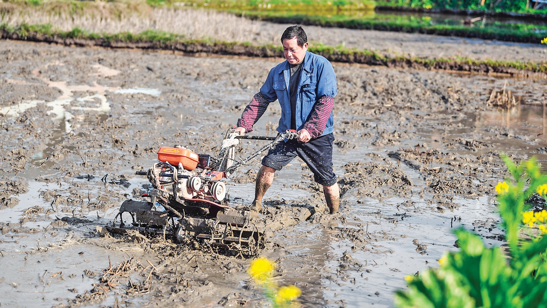 3月20日,广西三江侗族自治县良口乡农民在翻耕稻田。 新华社记者 张爱林 摄