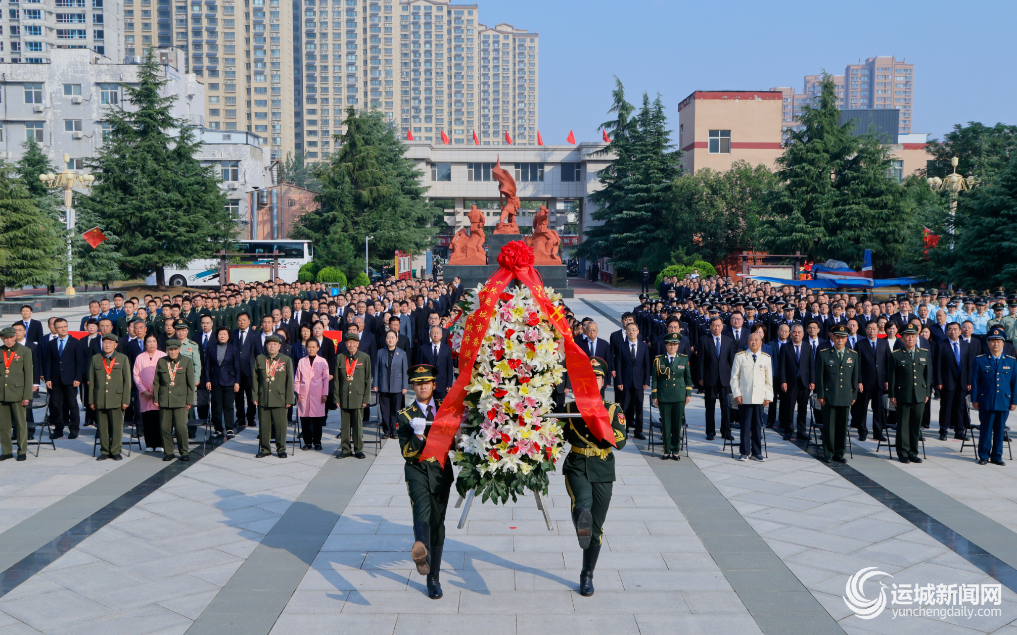 清晨的烈士陵园庄严肃穆,苍松翠柏环抱的运城解放纪念碑巍然矗立,碑身金色大字在晨光中熠熠生辉。市四大班子领导与老军人、驻运部队官兵、机关干部、学生等各方面代表,面向纪念碑整齐列队。