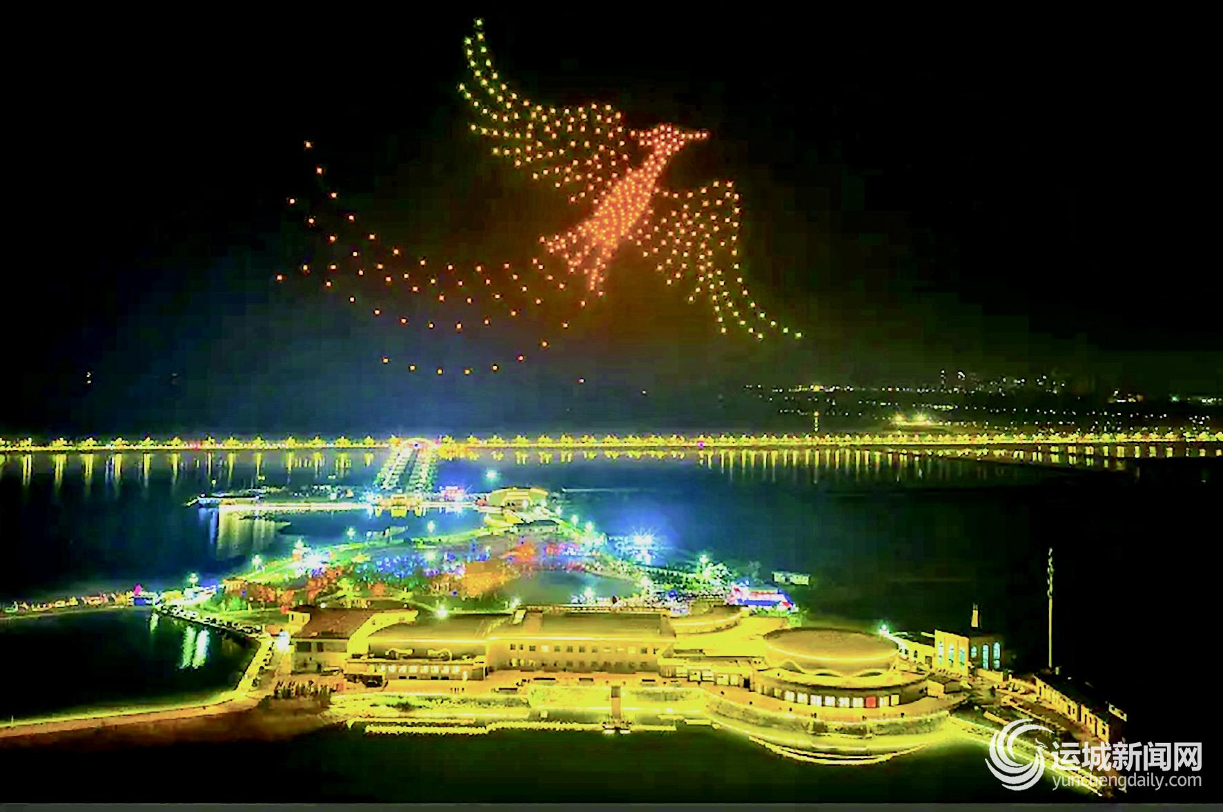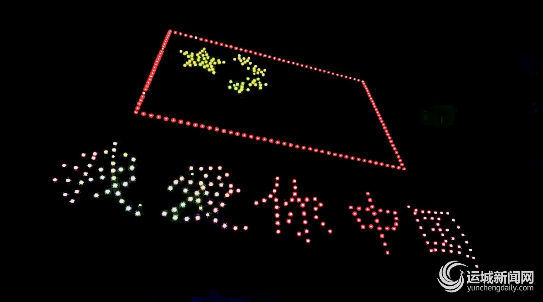 当铁花的余温尚未散尽,500架无人机悄然升空,如同训练有素的士兵,在夜空中精准排列。它们先是组合成巨大的五星红旗图案,红旗在夜风中“缓缓飘动”,紧接着,图案变换为“我爱你中国”5个汉字,最后定格为“我爱你运城”。