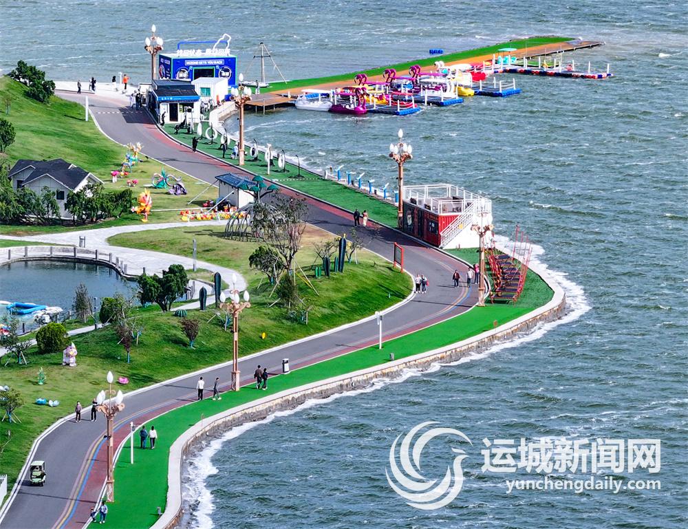 假期里,游客漫步于运城盐湖景区岸畔,尽享生态治理带来的诗意美景。