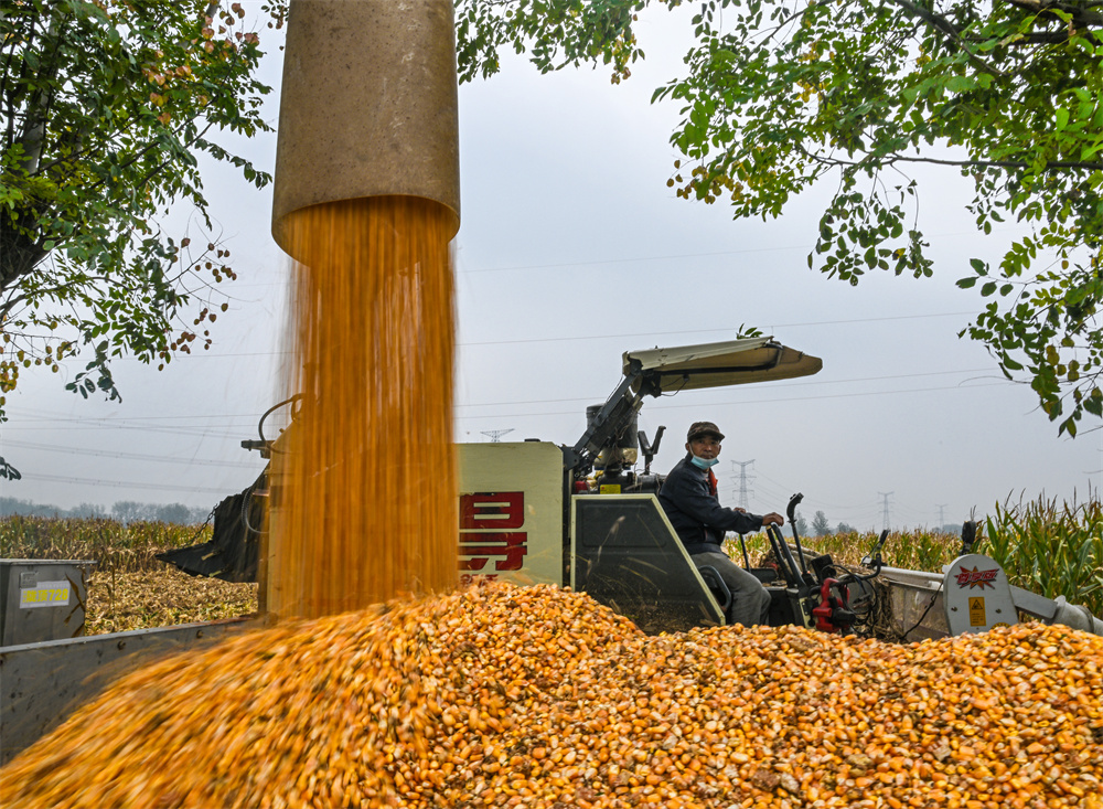 10月8日,河南省商丘市夏邑县会亭镇郭楼村农民驾驶收割机收获玉米。 新华社发
