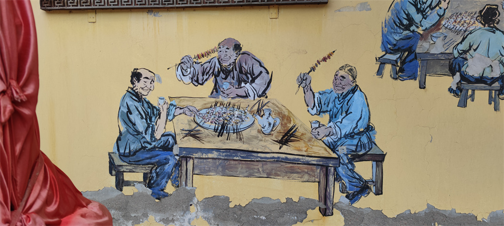 永济市华夏传统文化整理研究中心人们吃烤肉墙绘 记者 刘亚 摄