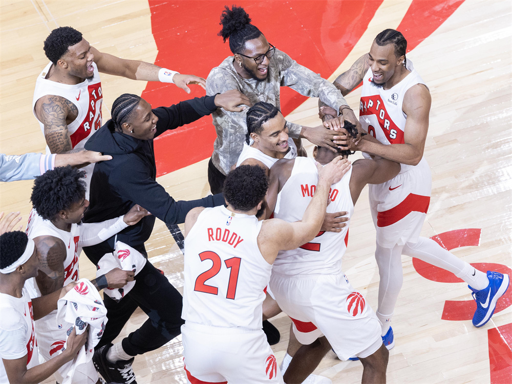 10月10日,猛龙队球员在比赛后庆祝胜利。