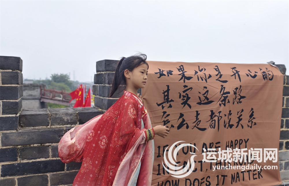 当10岁的雨欣穿着绯红齐胸襦裙站在河东池盐博物馆的城墙上,砖墙上“如果你是开心的,其实这条路怎么走都没关系”的标语布被风掀起一角,裙裾上的刺绣与城墙的青砖则让人看到了一幅跨越时空的美丽场景。