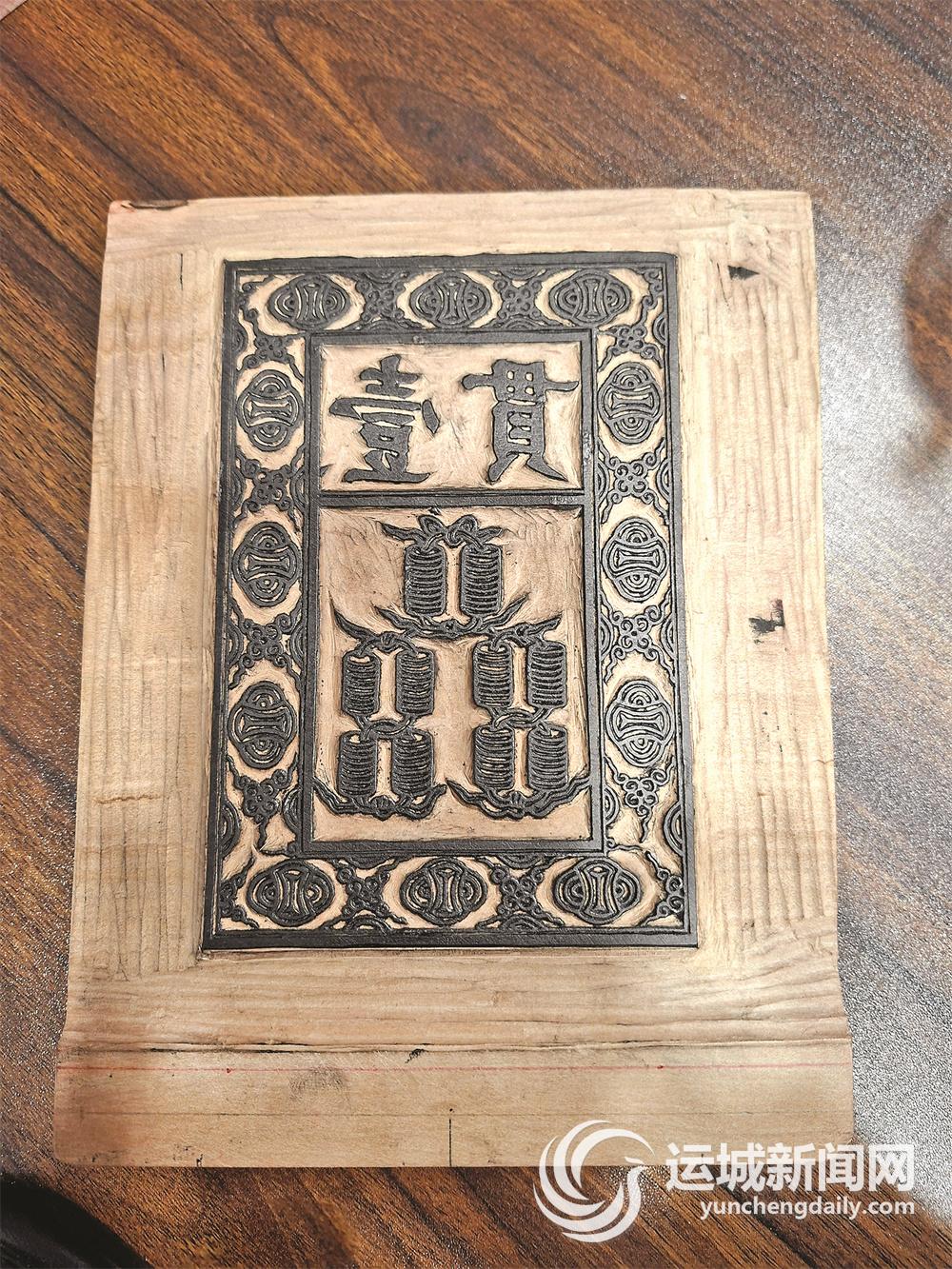 根据邵意茹的梳理,从外公的老师,再上溯两代,到她这里,蒲州木刻版画已传承至第五代。蒲州版画受当地民风影响,比较内敛、细腻,注重吉祥的寓意,比如“和合喜神”“招财纳福”、宋代银票等。她拿出一张自己雕刻的“壹贯”版画票说,在宋代,100多张一贯的银票就可以在都城买一座四合院了。在这里,版画,让遥远的历史“活”起来了。