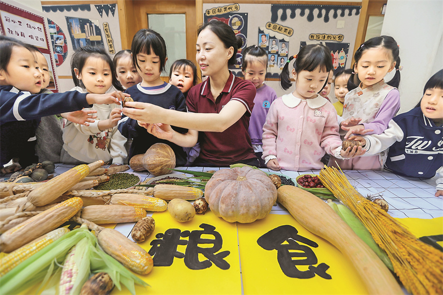 10月14日,在江苏省连云港市核电钟声幼儿园,老师教小朋友辨认五谷杂粮。新华社发(王 春 摄)
