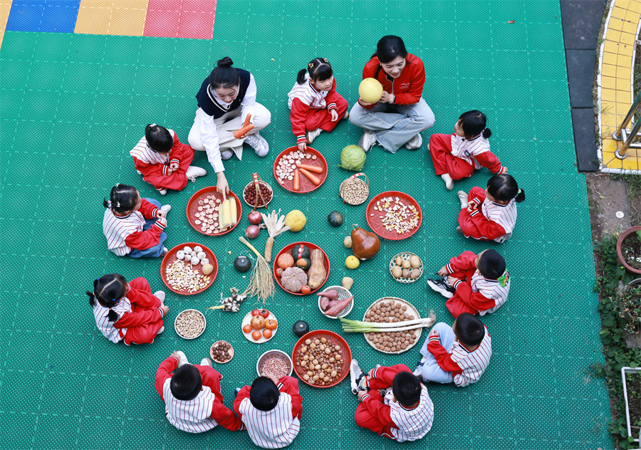10月14日,湖北省武汉市洪山区实验幼儿园小朋友在老师指导下学习辨识粮食。新华社发(赵 军 摄)