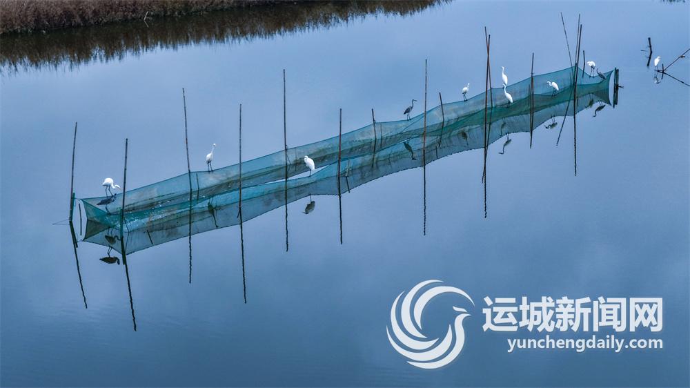 10月13日,雨后初晴,永济伍姓湖湿地中央,成群的白鹭、苍鹭、红头潜鸭等水鸟栖息在渔网之上,列队而立,静候鱼儿游近。浅绿的芦苇随风轻摇,碧蓝的湖面波光潋滟,细长的竹竿与渔网交织其间,与灵动的鸟影共同绘就一幅色彩斑斓、生机盎然的自然画卷。 特约摄影 程永仁