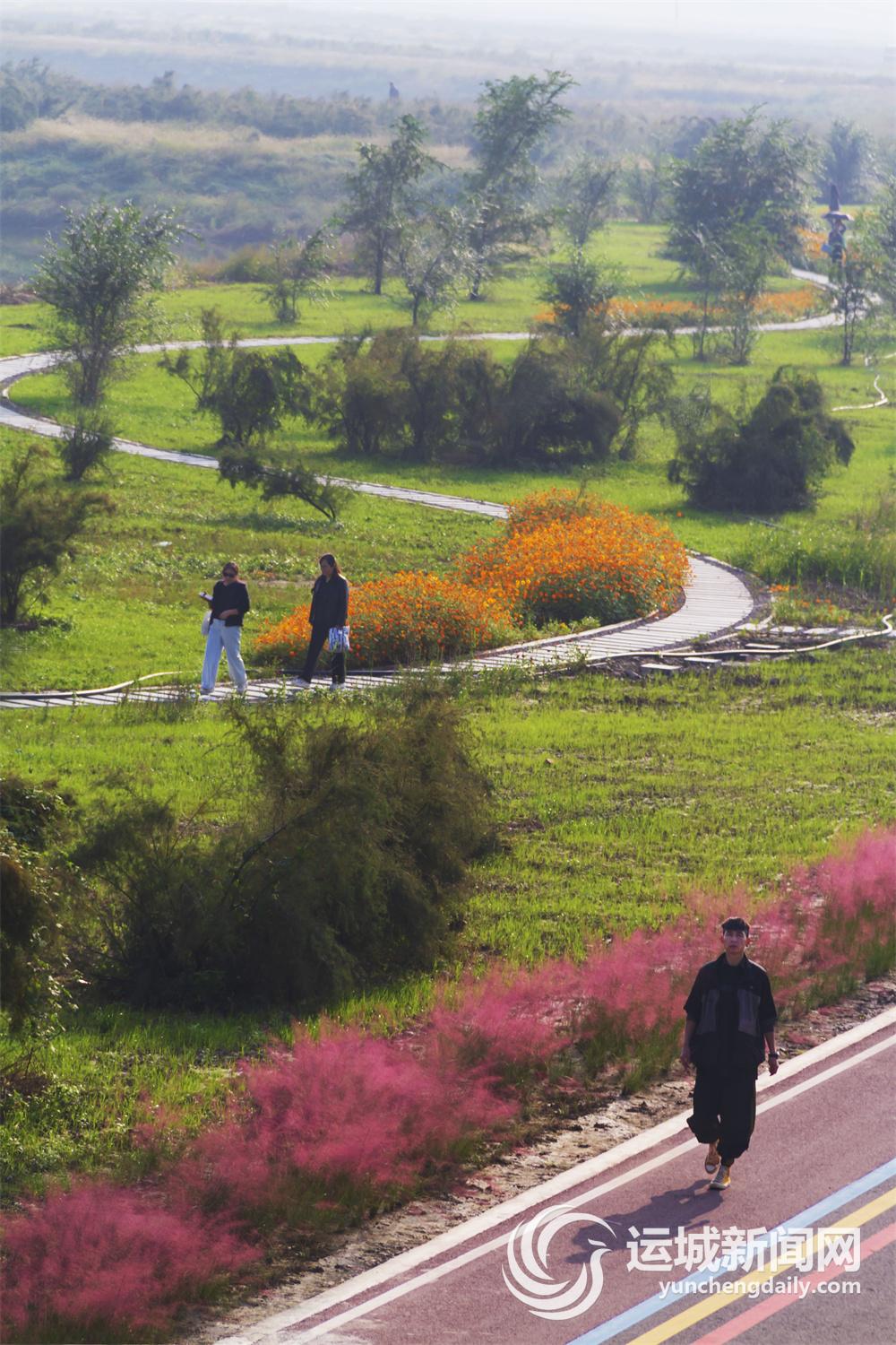 10月13日,游客在运城盐湖景区内的彩虹步道赏花游玩。
