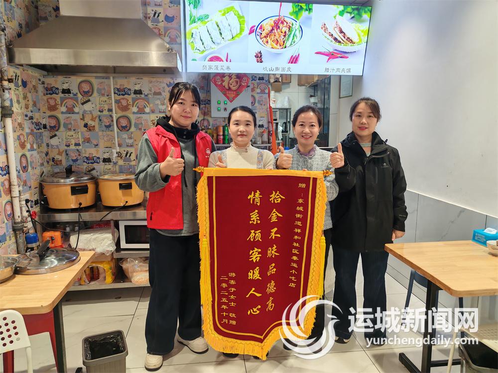 又讯(记者 杜磊 陈怡霏)10月15日上午,盐湖区东城街道祥和社区秦运小吃店收到一面特殊的锦旗,感谢该店店员拾金不昧的高尚品质(右图)。起因是国庆期间,来自山东威海的游客于女士在该店就餐时,不慎将相机遗失,第二日返回店里寻找时,店员确认身份后第一时间将物品归还。