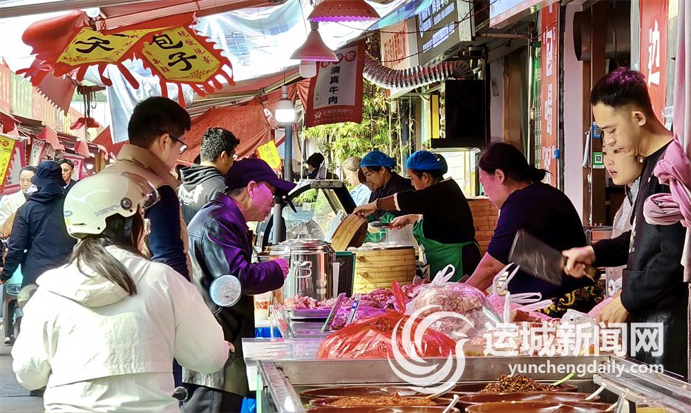 摊位前,“杂粮煎饼”摊主快速翻面,金黄的煎饼刚出锅就被游客捧在手中;“翟店烧饼”铺前,刚出炉的烧饼散发着麦香,食客们排着队争相选购;运城特产区的麻花、传统糕点堆得像小山,摊主不停打包称重,“最近外地客人还是特别多,糕点一出炉就卖空,每天备的货都得比平时多一倍!”