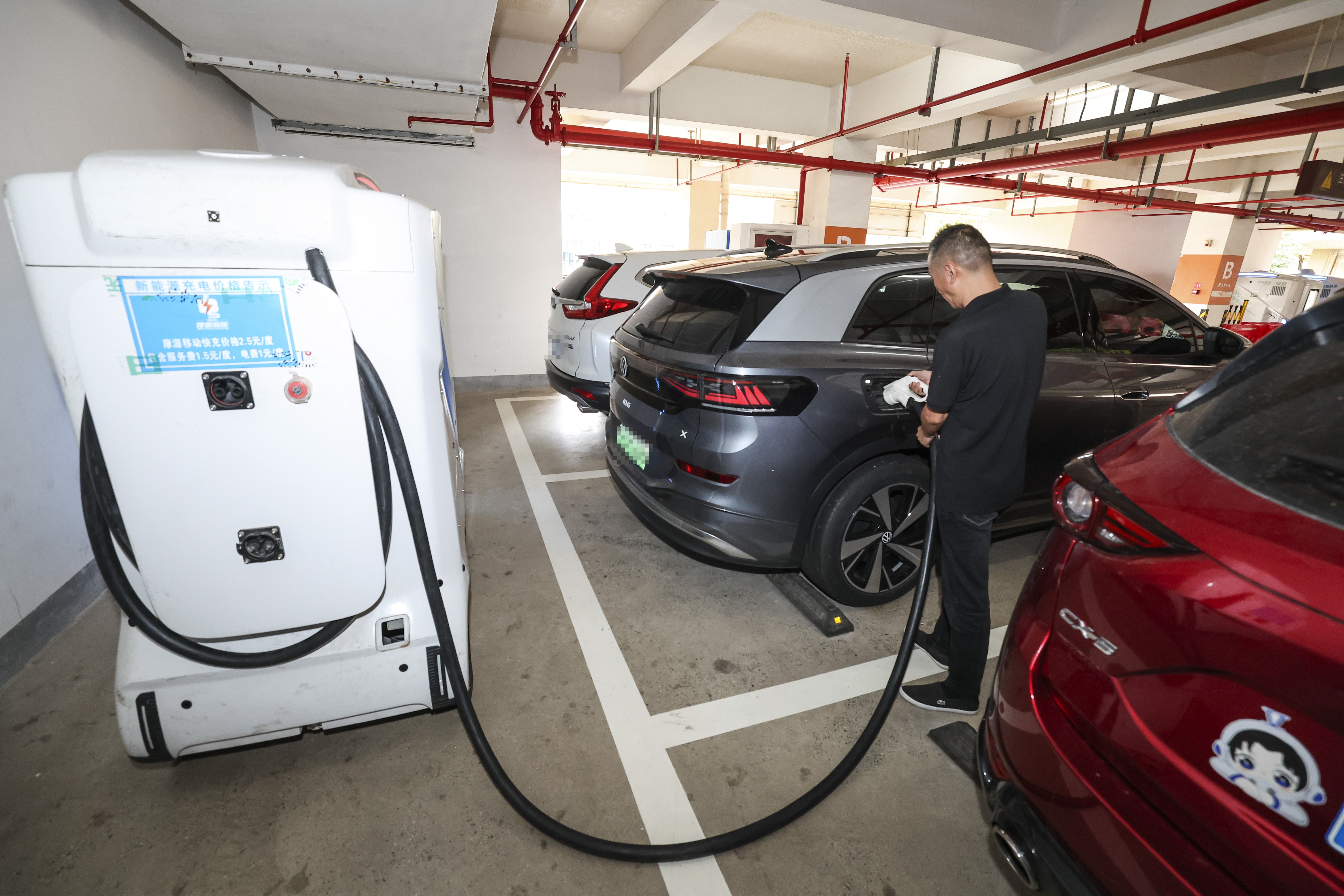 10月17日,游客在浙江舟山朱家尖蜈蚣峙码头停车场用无人充电车给自己的电动汽车充电。