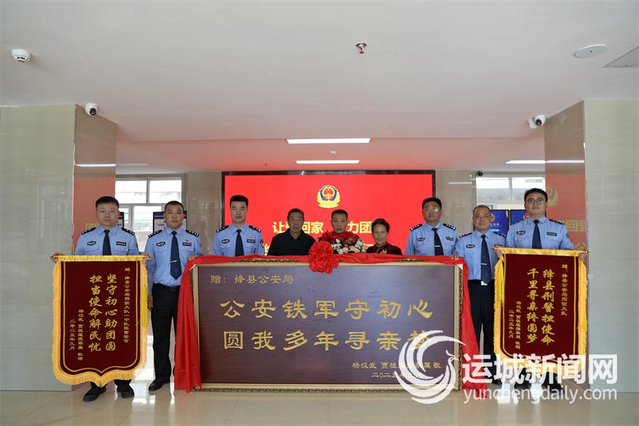 “感谢公安机关从未放弃,让我们在有生之年还能与儿子团聚。”老杨夫妇眼含热泪,向办案民辅警深深鞠躬。随后,二人将两面写有“坚守初心助团圆 担当使命解民忧”“绛县刑警担使命 千里寻亲终圆梦”的锦旗和一块写有“公安铁军守初心 圆我多年寻亲梦”的牌匾赠予绛县公安局,对公安机关表达了深深的感谢。