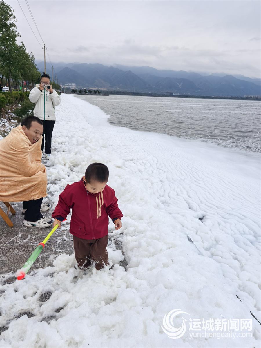 “远看还以为是湖面堆雪了,走近才发现是会流动的泡泡山!”“我要发朋友圈,说我去运城滑雪了……”
