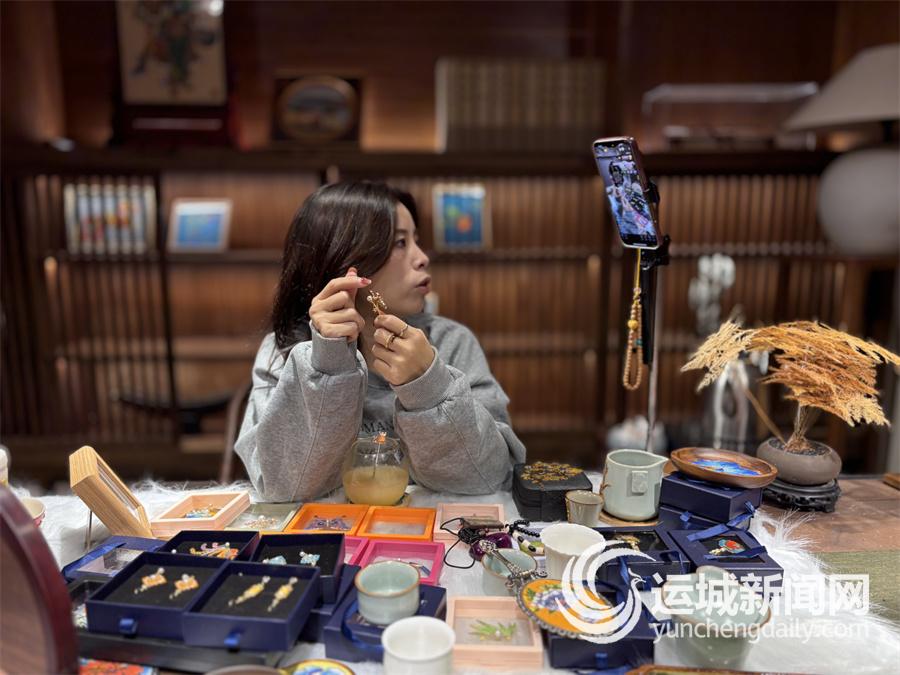 直播间则是她的“新战场”。上午11点左右,她会准时坐在镜头前,手上展示着她的作品,嘴里聊着运城掐丝珐琅的制作工艺和历史:“冬天衣服颜色深,这个珐琅胸针戴在身上特别亮眼”“结婚送伴手礼,选这个杯子,寓意‘一辈子’”……有次,一位天津的网友刷到直播,说第二天要坐高铁来运城,想给朋友买结婚礼物,梁琼霄连夜帮她设计了“百喜图”,对方体验完急着赶高铁,她则把成品处理好,自己出运费寄过去。“很多来运城玩的外地游客,逛着逛着就来到工作室。在这里体验完我再帮他们邮寄回去,不能让他们白跑一趟。”她说。
