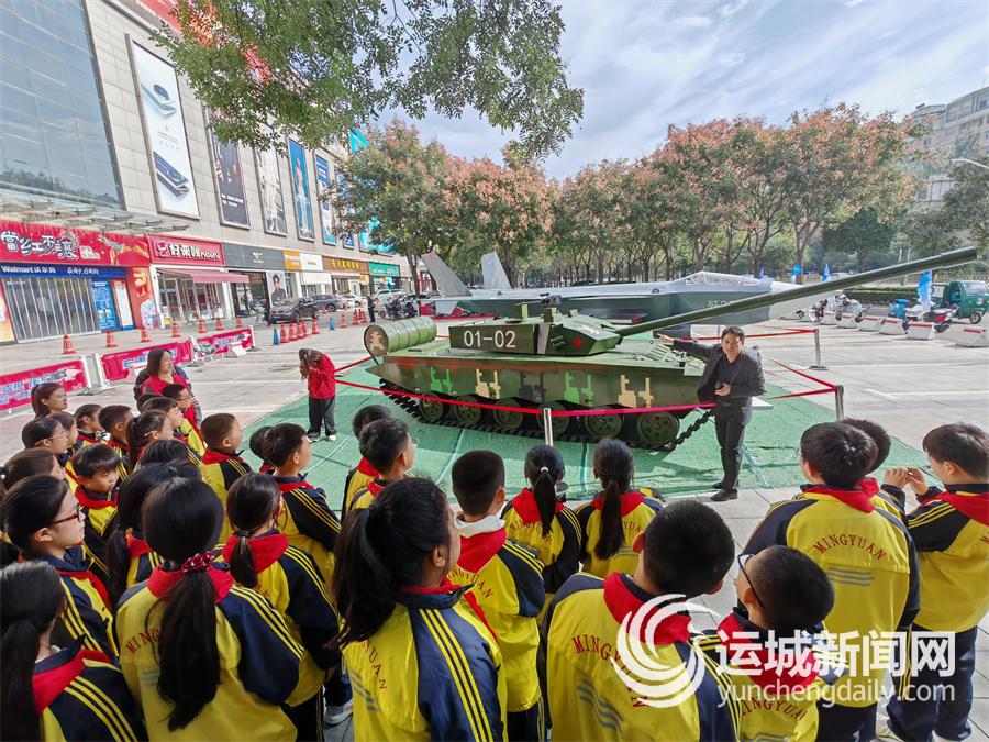 10月14日上午,在新象城南广场,运城市明远小学的40余名高年级学生正围在歼-20战斗机、99A式主战坦克1:1复刻模型旁,开启一场震撼的“大国重器”探索之旅。